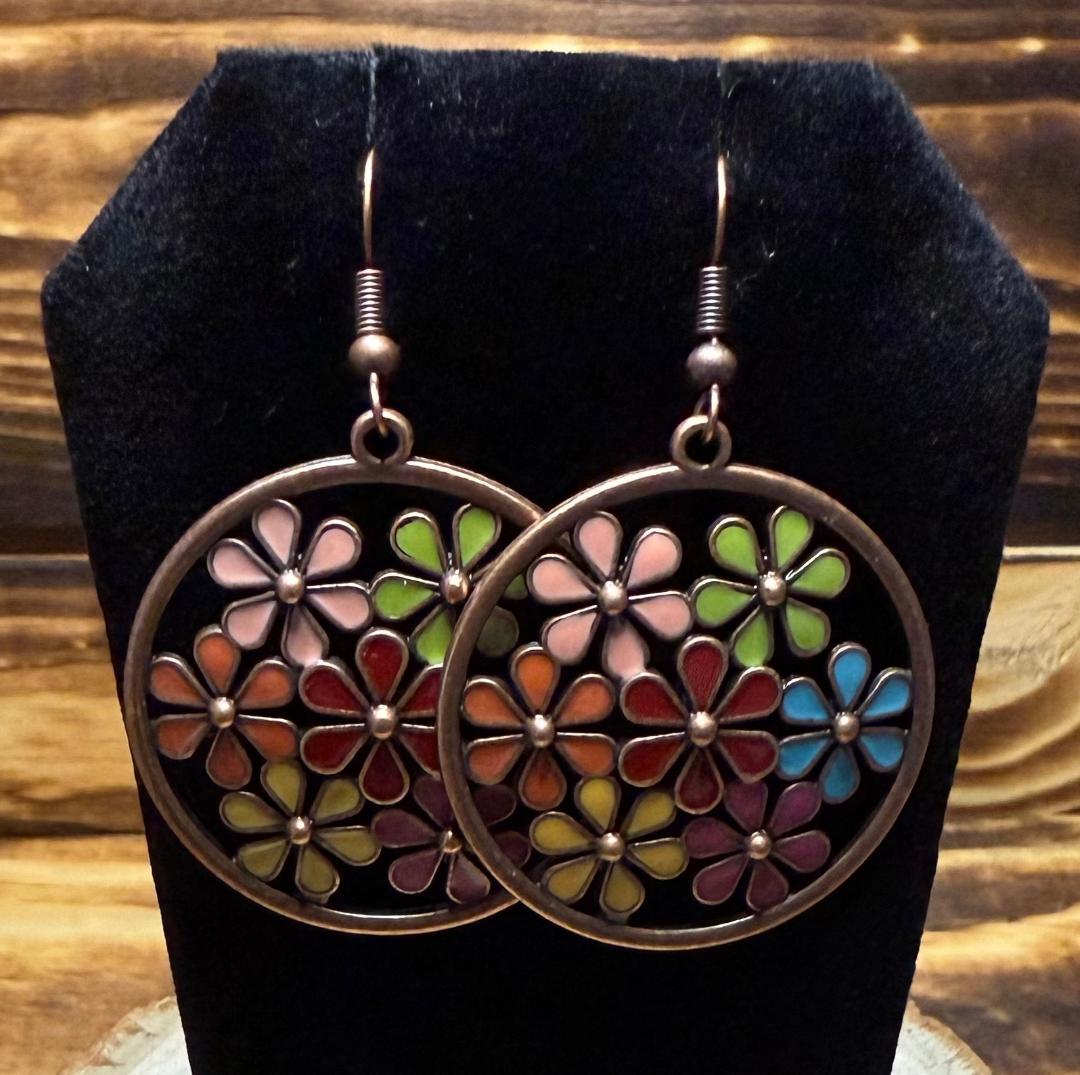 A cute hoop charm, brass color metal alloy with multiple different colored enamel flowers throughout the center. Made with nickel free earring hooks.