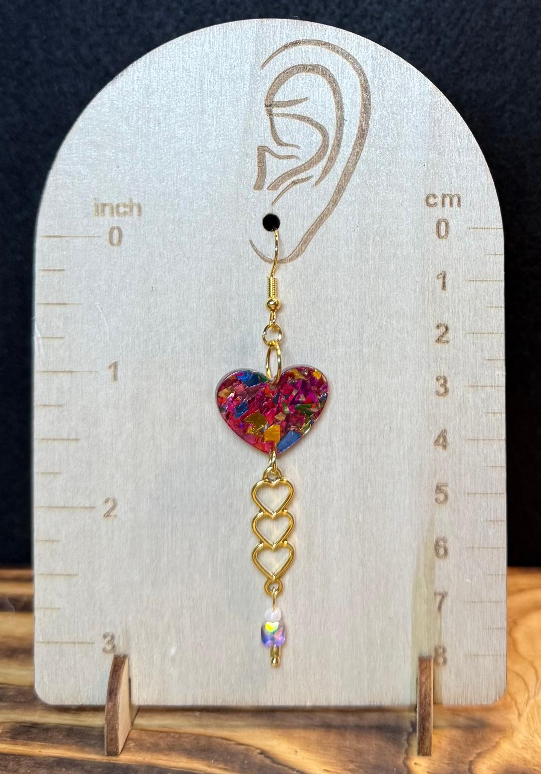 A fun pair of earrings with the focal point being a double sided acrylic heart in a confetti theme.  Below is a triple cascading heart charm, as well as an iridescent glass bead.  Made with nickel free earring hooks.