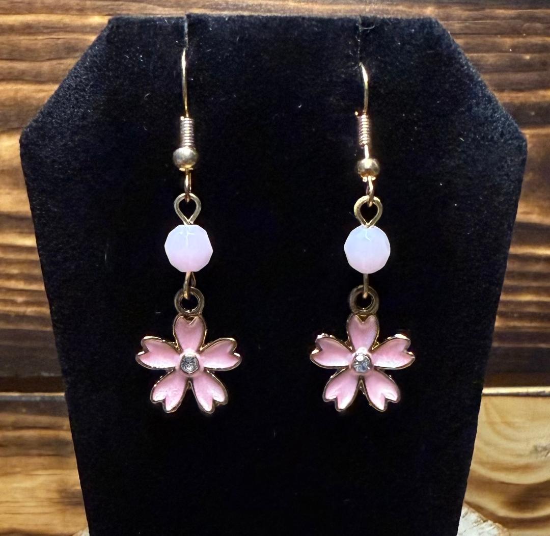 A darling little pair of enamel pink flower earrings with a rhinestone center, topped with a pink faceted bead. Made with nickel free earring hooks.