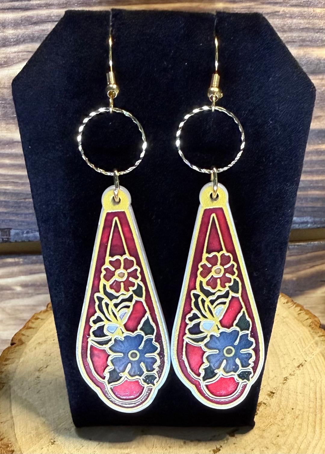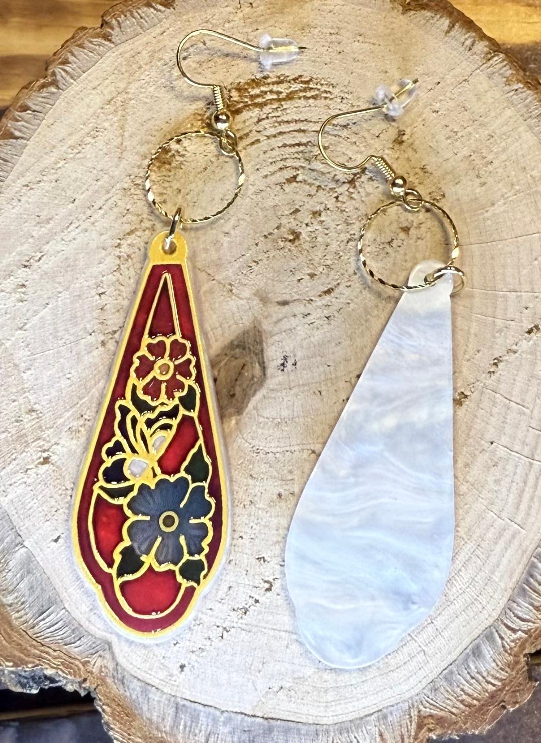 A lovely pair of extra long, Asian style earrings in red with lovely flowers. They are acrylic (plastic), with a pearlized back. Very light to wear, not heavy on the ears. They have a large embossed gold jump ring for extra dangle. Made with 18K gold plated, nickel free earring hooks.