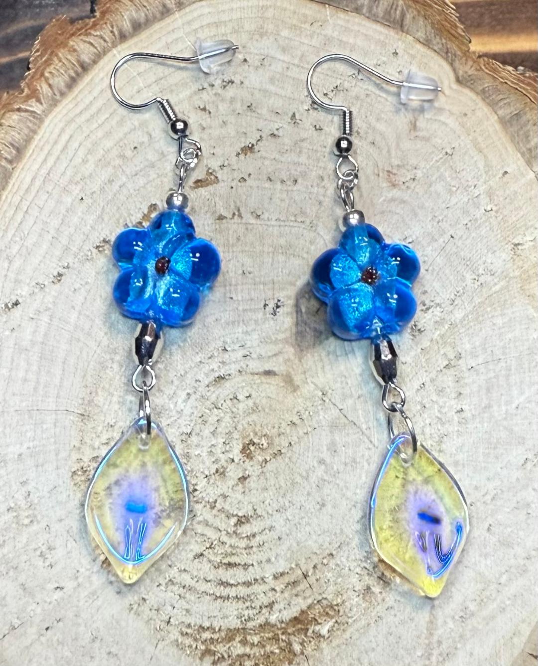 NEW Teal Blue Glass Flower Earrings w/ Lily Petal Charms
